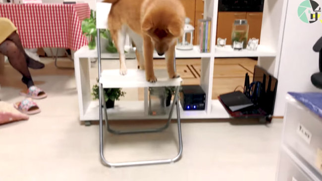 そんな社長は高いところが苦手。しかし、ある程度の高さのところから飛び降りることができなければ、なにかあったときにもちょっと心配になるもの。だからこのくらいは……と練習を兼ねて柴犬社長が乗せられたのは、椅子の上でした。