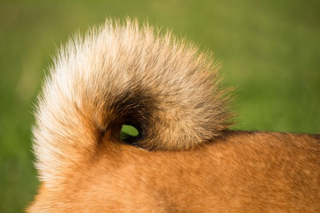 太く力強く、くるりと巻いた巻き尾が一般的です。まれに、背中に向かって鎌のように伸びる差し尾も見られます。